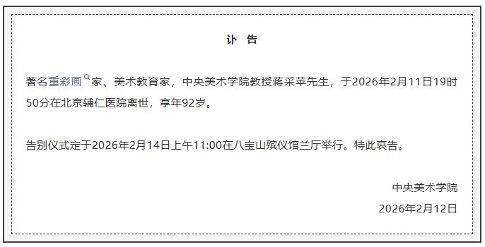 2月12日,中央美术学院发布讣告:2026年著名重彩画家、美术教育家,中央美术学院教授蒋采苹先生,于2026年2月11日19时50分在北京辅仁医院离世配资网查询,享年92岁。