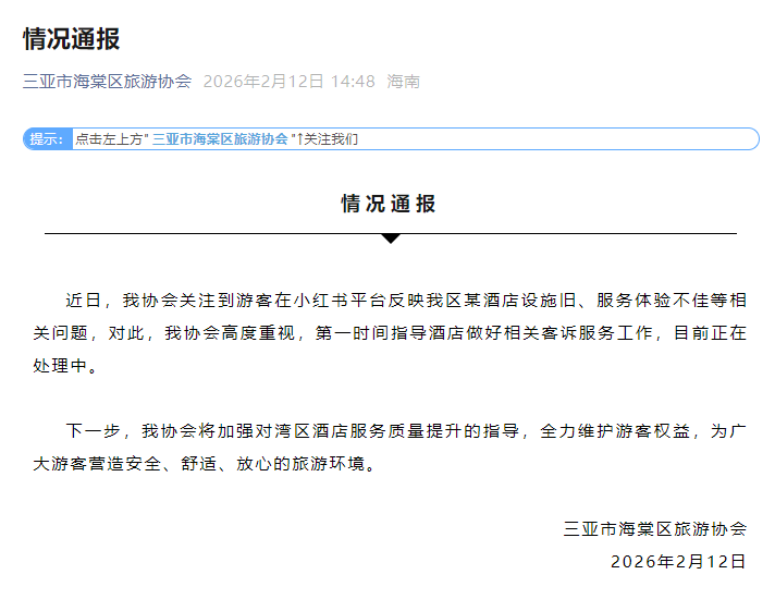 近日,我协会关注到游客在小红书平台反映我区某酒店设施旧、服务体验不佳等相关问题,对此,我协会高度重视,第一时间指导酒店做好相关客诉服务工作,目前正在处理中。